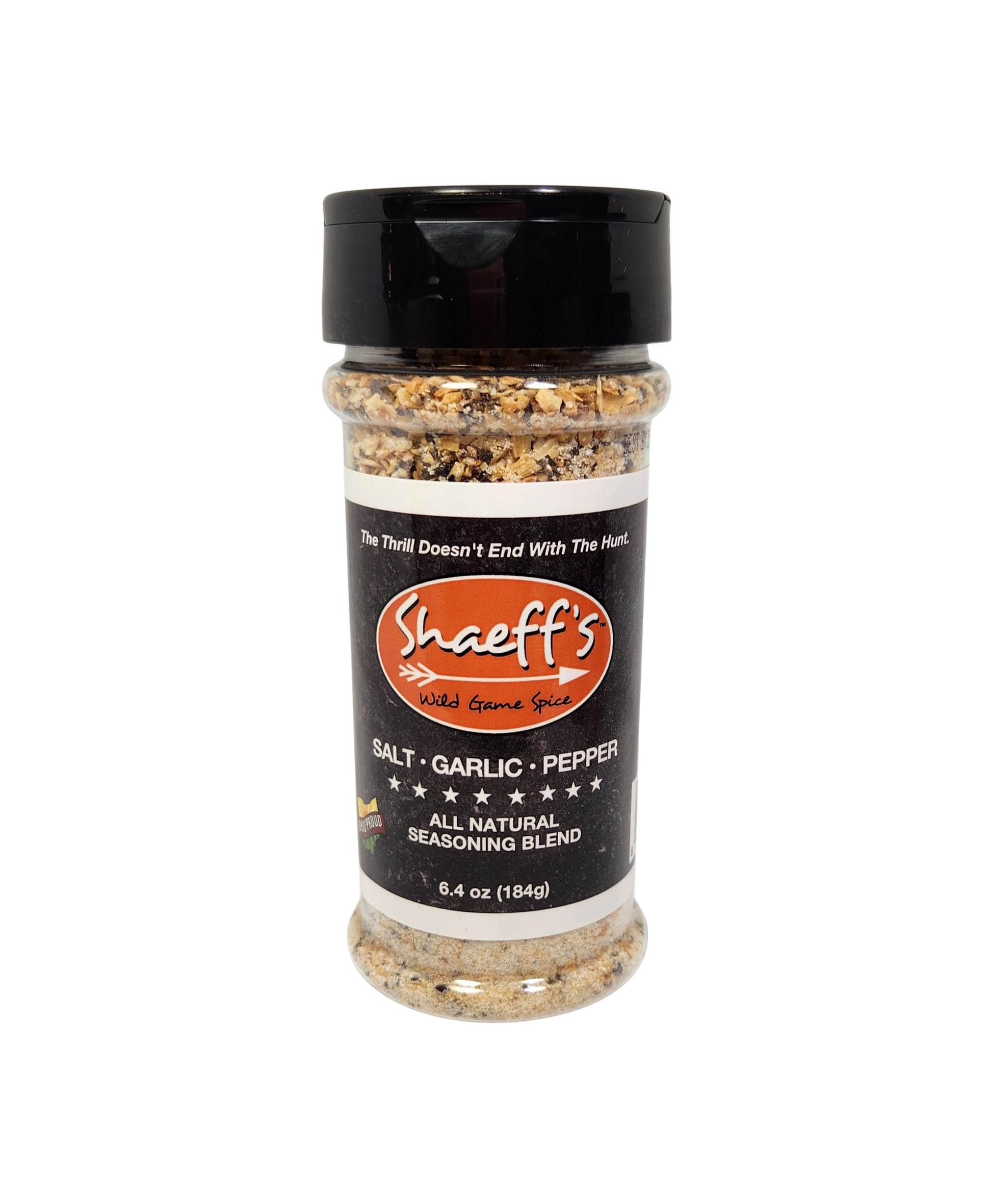 Shaeff's Salt, Garlic & Pepper Seasoning (6.4 oz): A go-to seasoning to make any meal delicious—whether it’s fresh venison, fish, or breakfast eggs.